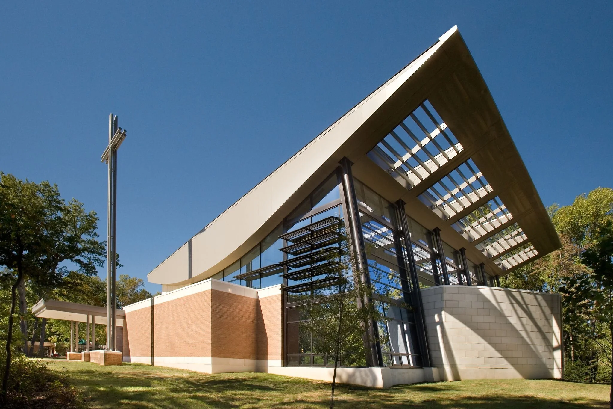 In contrast to their original dark and “inward” looking sanctuary located on the backside of the building, the congregation asked the architects for a new sanctuary that would be "uplifting" and allow them to be in touch with the natural environment, as well as serve as a welcoming beacon in the community. The new wing was sited so the sanctuary sits on a knoll above the street. This placement also gives the congregants a 180 degree view of their fully-wooded site.